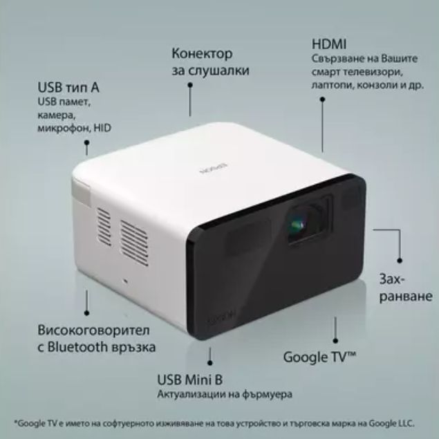 Други:Google TV, Automatic keystone correction, Built-in speaker, Chromecast, Google search, Horizontal and vertical keystone correction, Instant on/off, Quick Corner; 2D Colour Modes: Dynamic, Natural, Cinema, Vivid