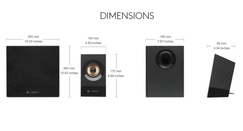 Размери, mm:Satellite: 100 x 170 x 85 mm, Subwoofer: 255 x 265 x 195 mm, Control pod - 72 x 55 x 72 mm