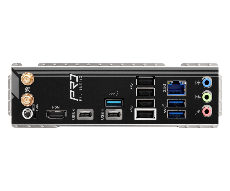I/O:2 x Antenna Ports;1 x HDMI Port;2 x USB4 Type-C Ports (40 Gb/s);2 x USB 3.2 Gen2 Type-A Ports (10 Gb/s);1 x USB 3.2 Gen1 Type-A Port;4 x USB 2.0 Ports;1 x RJ-45 LAN Port;1 x BIOS Flashback Button;HD Audio Jacks: Line in / Front Speaker / Microphone