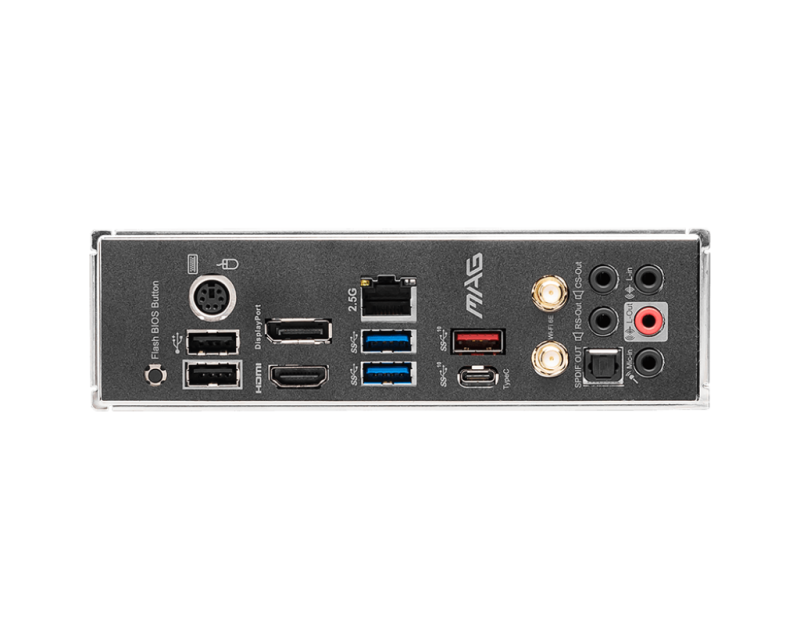 I/O:Keyboard / Mouse; DisplayPort 1.4; 2.5G LAN Port; USB 3.2 Gen 2 10Gbps Type-A; Wi-Fi / Bluetooth Antenna; Audio Connectors; Flash BIOS Button; USB 2.0 Port; HDMI™ 2.1 Port; USB 3.2 Gen 1 5Gbps Type-A; USB 3.2 Gen 2 10Gbps Type-C; Optical S/PDIF OUT