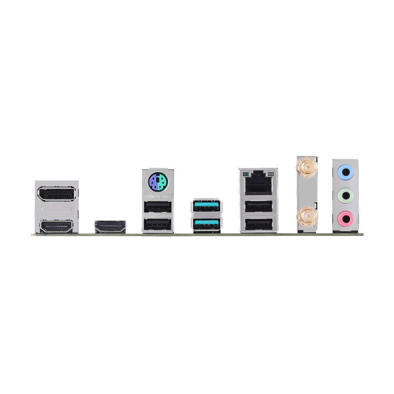 Back Panel I/O Ports; 2 x USB 3.2 Gen 2 ports (2 x Type-A ); 4 x USB 2.0 ports (4 x Type-A); 1 x DisplayPort; 2 x HDMI® ports; 1 x Wi-Fi Module; 1 x Realtek 2.5Gb Ethernet port; 3 x Audio jacks; 1 x PS/2 Keyboard/Mouse combo port