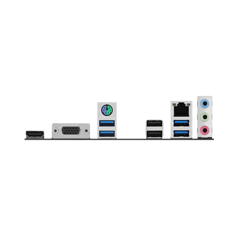 I/O:4 x USB 3.2 Gen 1 (5G) ports (4 x Type-A);2 x USB 2.0 ports (2 x Type-A);1 x VGA port;1 x HDMI™ port;1 x Realtek 1Gb Ethernet port;3 x Audio jacks;1 x PS/2 Keyboard/Mouse combo port