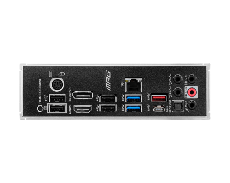 I/O:PS/2 Combo Port; DisplayPort; LAN Port; USB 3.2 Gen 2 10Gbps (Type-A); HD Audio Connectors; Flash BIOS Button; USB 2.0; HDMI™; USB 2.0; USB 3.2 Gen 1 5Gbps (Type-A); USB 3.2 Gen 2 10Gbps (Type-C); Optical S/PDIF OUT