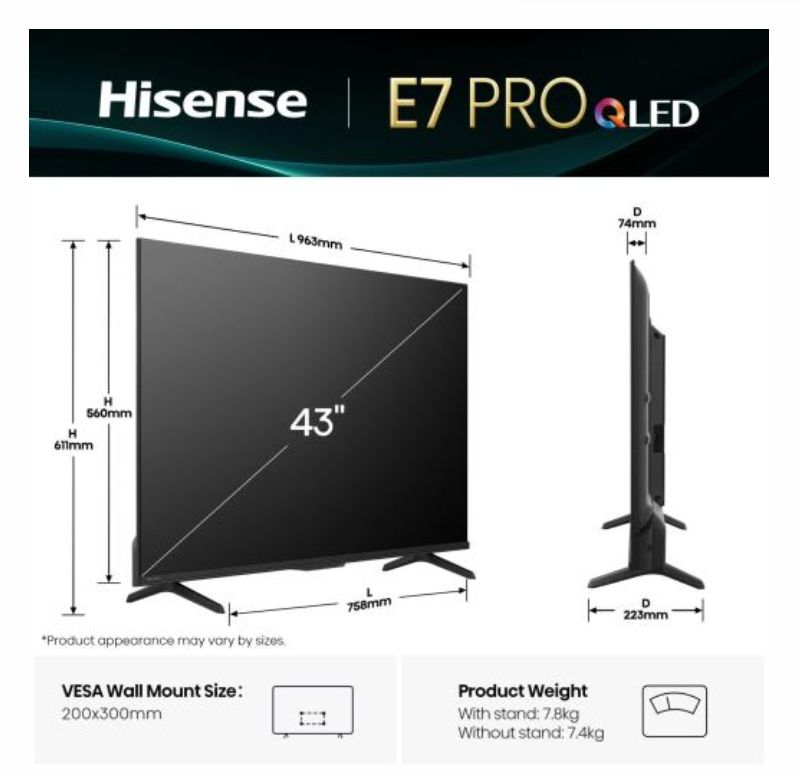 Телевизор Hisense 43" E7Q Pro, 4K Ultra HD 3840x2160, QLED, Quantum Dot, 144Hz, HDR 10+ adaptive, HLG, Dolby Vision, DTS Virtual X, Smart TV, WiFi 5GHz, WiFi Direct, BT, Anyview Cast, 3xHDMI, 2xUSB, LAN, CI+, DVB-T2/C/S2, Black