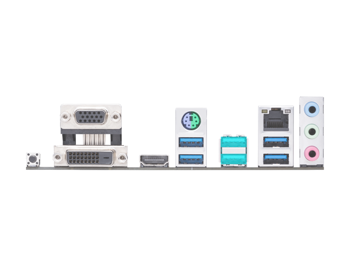I/O:1 x PS/2 keyboard/mouse combo port(s); 1 x DVI-D; 1 x D-Sub; 1 x HDMI; 1 x LAN (RJ45) port(s); 2 x USB 3.2 Gen 2 (teal blue) (2 x Type-A); 4 x USB 3.2 Gen 1 (blue) Type-A; 3 x Audio jack(s); 1 x BIOS FlashBack™ Button(s)