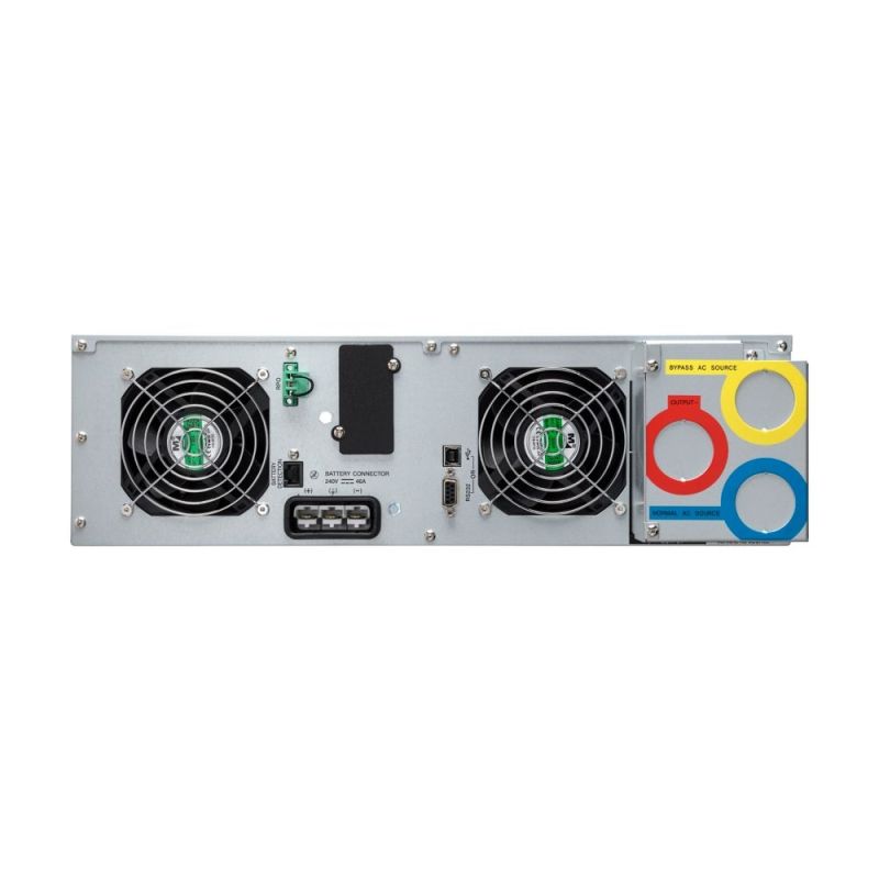 Тип изводи:Terminal block; Input: Terminal block (63A); Communication: USB port (HID compliant), Serial port (RS232), Mini-terminal block for remote power off, One slot for optional communication card