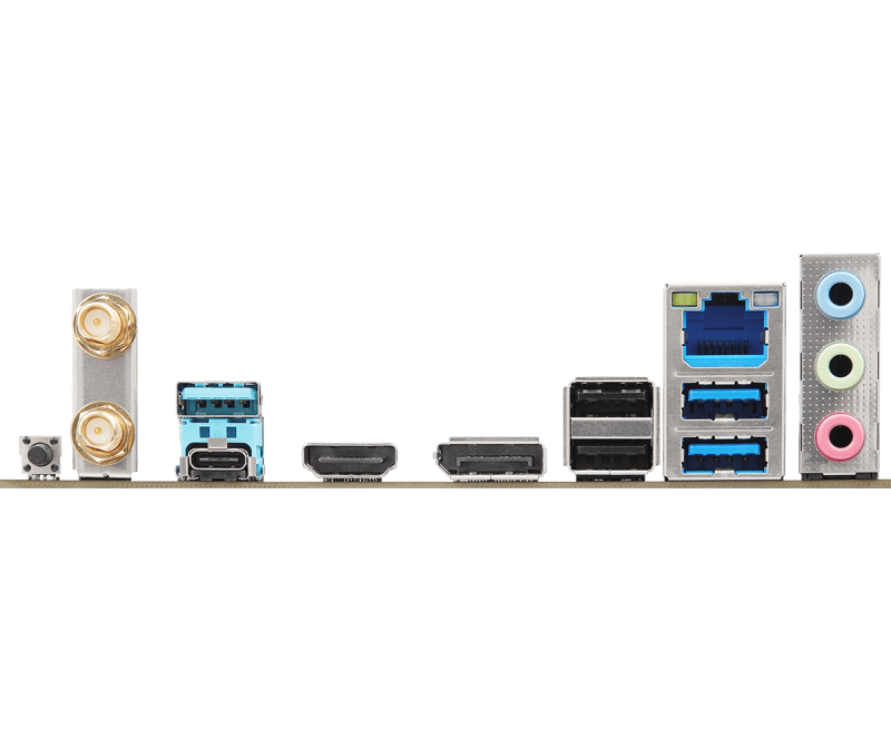 I/O:2 x Antenna Ports;1 x HDMI Port;1 x DisplayPort 1.4;1 x USB 3.2 Gen2x2 Type-C Port (20 Gb/s);3 x USB 3.2 Gen1 Ports;2 x USB 2.0 Ports;1 x RJ-45 LAN Port;1 x BIOS Flashback Button;HD Audio Jacks: Line in / Front Speaker / Microphone