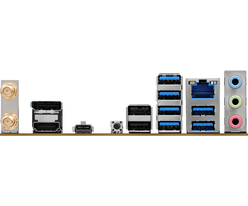 I/O:2 x Antenna Ports;1 x HDMI Port;1 x DisplayPort 1.4;1 x USB 3.2 Gen2x2 Type-C Port (20 Gb/s; 6 x USB 3.2 Gen1 Ports;2 x USB 2.0 Ports;1 x RJ-45 LAN Port;1 x BIOS Flashback Button;HD Audio Jacks: Line in / Front Speaker / Microphone