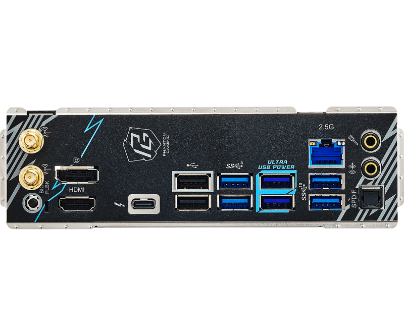 I/O:2 x Antenna Ports;1 x HDMI Port;1 x DisplayPort 1.4;1 x Optical SPDIF Out Port;1 x Thunderbolt™ 4 Type-C Port (40 Gb/s for USB4 protocol; 40Gb/s for Thunderbolt™ protocol);2 x USB 3.2 Gen2 Type-A Ports (10 Gb/s);4 x USB 3.2 Gen1 Ports;2 x USB 2.0 Ports...