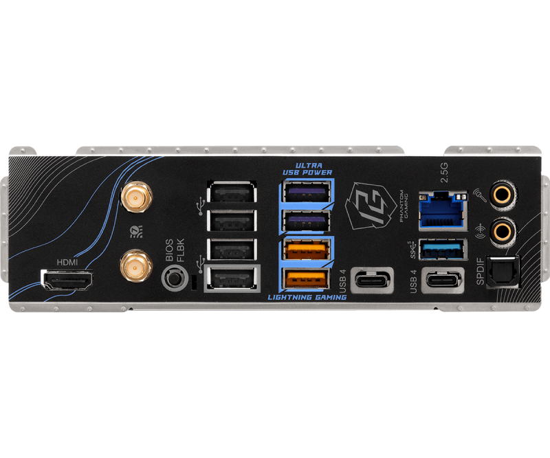 2 x Antenna Ports;1 x HDMI Port;1 x Optical SPDIF Out Port;2 x USB4 Type-C Ports (40 Gb/s);3 x USB 3.2 Gen1 Type-A Ports (USB32_12 are Lightning Gaming Ports.);2 x USB 3.2 Gen2 Type-A Ports (10 Gb/s) (USB32_34 supports Ultra USB Power.);4 x USB 2.0 Por...