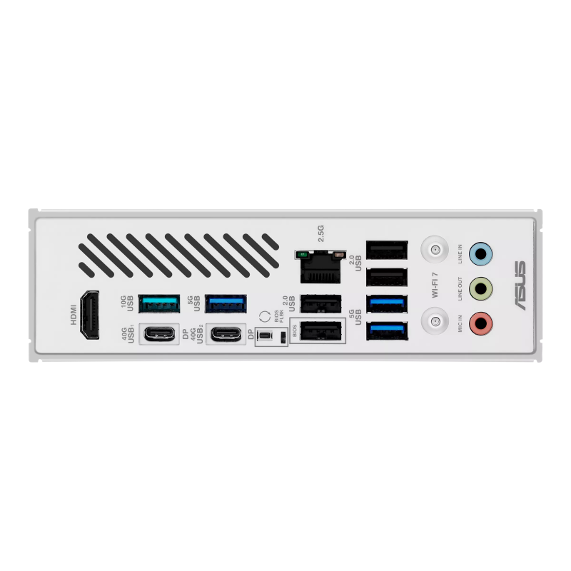 I/O:2 x USB4® (40Gbps) ports (2 x USB Type-C®);1 x USB 10Gbps port (1 x Type-A);3 x USB 5Gbps ports (3 x Type-A);4 x USB 2.0 ports (4 x Type-A);1 x HDMI™ port;1 x Wi-Fi module;1 x Realtek 2.5Gb Ethernet port;3 x Audio jacks;1 x BIOS FlashBack™ button