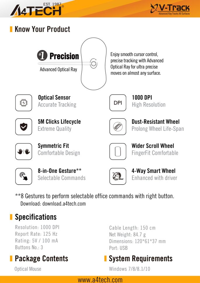 A4tech OP-330S Оптична мишка V-Track, безшумен клик, 1000 dpi,USB черна
